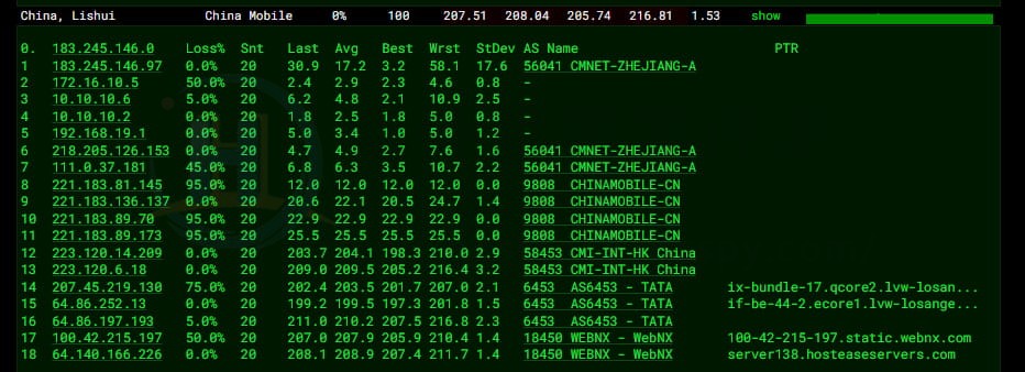 全国三网Ping的平均延迟在196ms,其中电信网络延迟在178ms,联通网络延迟在192ms,移动网络延迟在231ms,港澳台地区延迟在137ms左右。