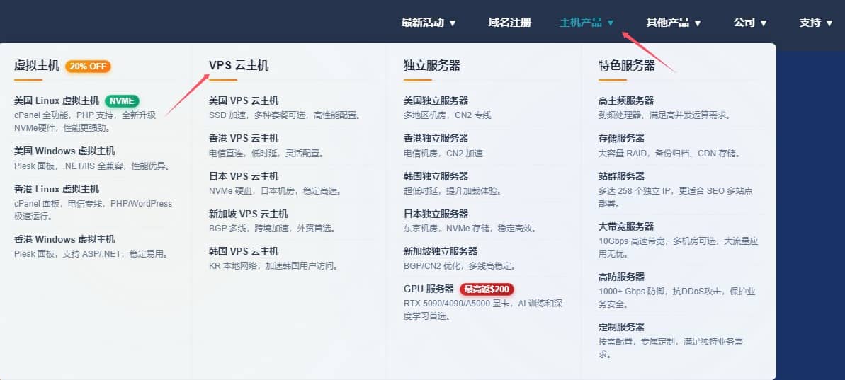 2、在官网顶部的导航栏中,找到“主机产品”,选择“VPS云主机”,可以看到多种海外VPS类型,如美国VPS、日本VPS、新加坡VPS、韩国VPS,用户可以按需选择合适的方案。