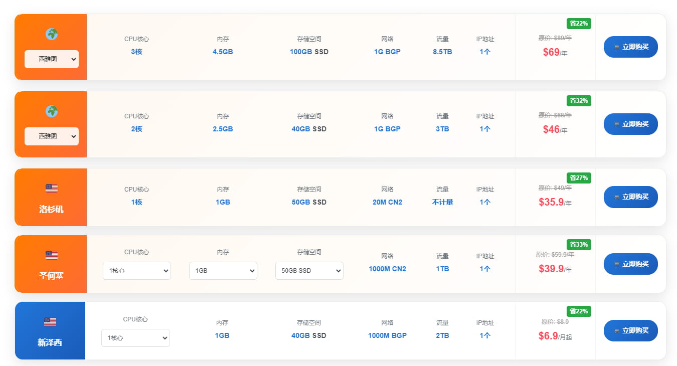 | CPU | 内存 | 存储空间 | 网络 | 流量 | 机房 | 价格/年 | 购买链接 |