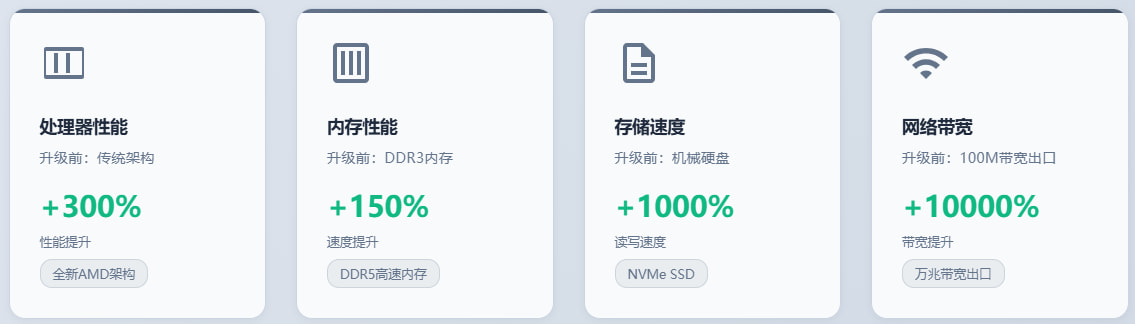 HostEase虚拟主机升级完成后,用户可以体验全新AMD架构处理器、DDR5高速内存、NVMe SSD存储、美国&香港双机房可选,进而享受前所未有的速度提升与稳定性保障。