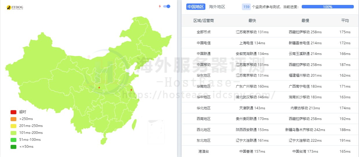 HostEase新加坡CN2服务器全国三网Ping的平均延迟在175ms,其中电信网络延迟在172ms,联通网络延迟在166ms,移动网络延迟在187ms。