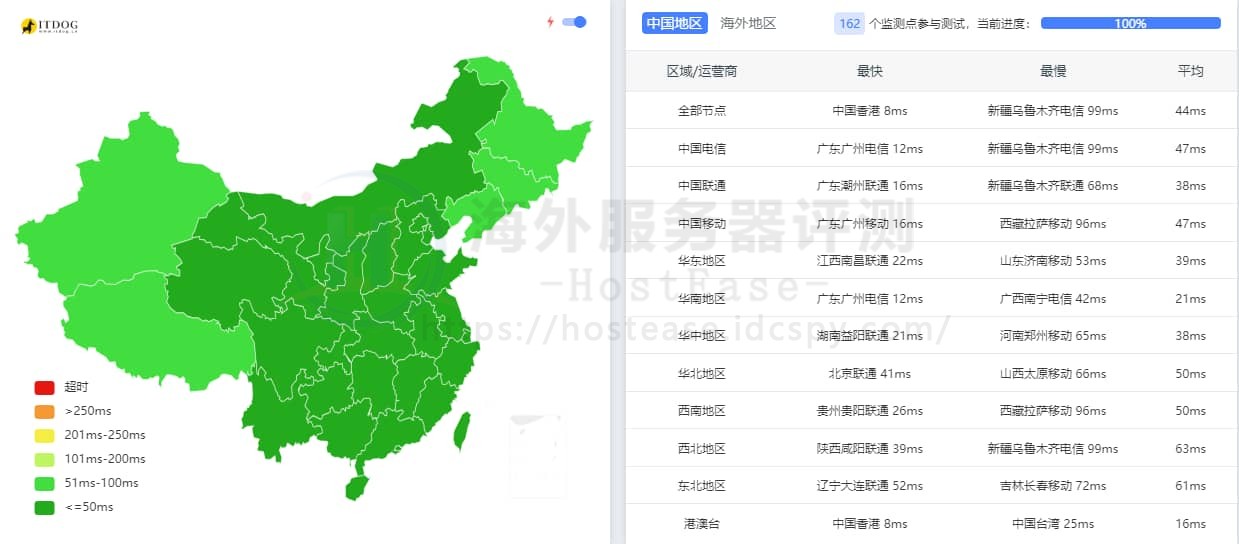 Ping值:HostEase中国香港VPS到国内各地区的平均速度为44ms。